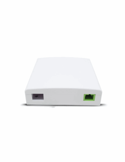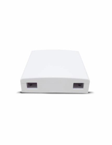 Roseta terminal de fibra óptica compacta para instalaciones FTTH. Fácil de instalar, segura y compatible con conectores SC/APC y SC/UPC.