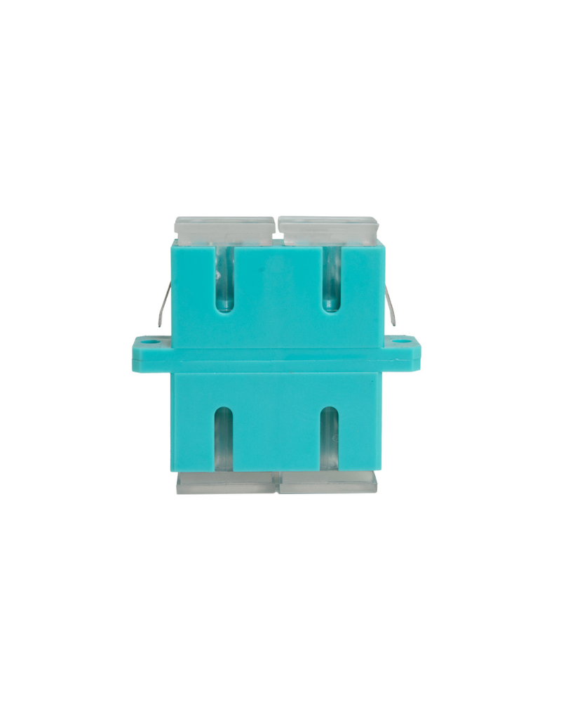 Acoplador de fibra óptica SC dúplex multimodo OM3 en color aqua. Alta precisión, baja pérdida y confiabilidad en conexiones de redes ópticas.