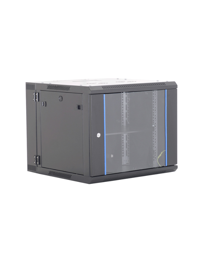Gabinete de pared 6RU 368x600x450+100mm abatible con puerta de vidrio de seguridad, resistente y práctico para equipos de red, control y telecomunicaciones.